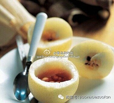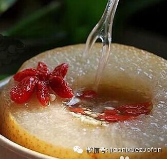 先把白梨挖去核,将蜂蜜填入,加热蒸熟.每日早晚各吃1个,连吃数日.