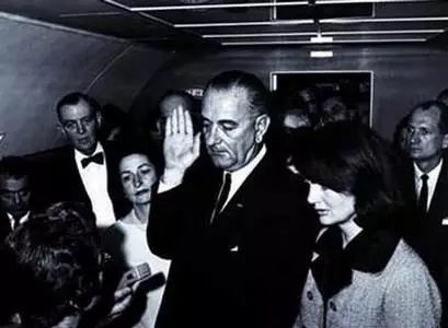 在肯尼迪遇刺后宣誓就职的约翰逊,左边是其妻子,肯尼迪太太在右边