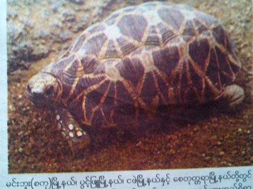 至于龟类,据统计在缅甸发现的龟类有32种,其中5种属于海龟类,27种属淡水龟类,这淡水龟中又只有4种能在陆地上生存,这当中最珍贵的就是“星龟”了,英文就称为“Star Tortoise”。该龟每年10月下蛋,每次只产4、5粒蛋,而这些蛋要在来年5月才能孵出小龟。该星龟只见于此瑞射陶地区,故显得特别珍贵,一些国外人士(特别是日本人)又认为此种龟是吉祥之物而把它当作宠物饲养。由于这原因,国外需求量特大而导致人们的大规模捕猎,几乎使这星龟绝种。现在国家方面已立法保护这稀有动物了。