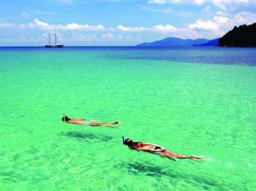 海水透明、湛蓝,靠近沙洲的浅滩则稍带淡绿色,像无邪的孩子用毡尖笔画出来的一般。周围,几十个岛屿从水中探出尖顶,宛如失落的世界重现人间。所有露出水面的地方都郁郁葱葱,桃花心木、柚木、无花果树……是那样生机勃勃,仿佛要把整个岛屿挤满。同来的游客们在一个无名岛附近抛锚下船,三五成群地在奶油色的浅滩上散步或尝试潜水。波澜不惊的海平面下,潮汐冲击着水下山脊,形成一个个形似口袋的洞窟,里面生满斑斓的贝类。