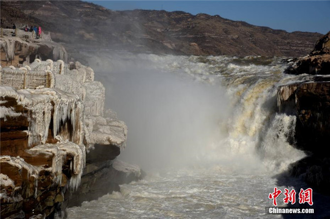 山西黄河壶口瀑布现冰瀑彩虹美景 游人扎堆