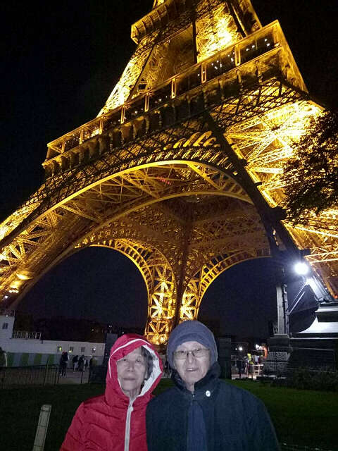游览圣河之后,因事先买了票,可以到大型升降梯处排队,准备参观著名的巴黎铁塔。升降梯每次大约容纳五十名游客,它只把游客们送到第一层和笫二层,去第三层还要另外买票 。在售票处,想上去第三层的游客也排成很长的队伍。我们只好上到第一层和第二层观看周围的夜景,也照集体相留影。