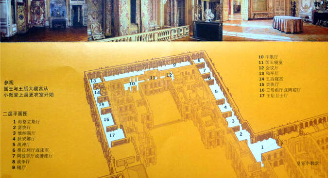 参观的游客们进入宫时每人都分配到一部讲解器,进到宫内的房间时,可以在讲解器上按房间的号码,就可听到讲解员详细讲解的声音。我们跟随游客们在各个大厅堂内游览,不知不觉地花去了三个多钟头(连排队及等人的时间在内) 。虽然大家都感到好累,但能参观到法国富丽堂煌的王宫,也从巨大的墙壁画上观看到了法国经历了30多场的战争后,战胜德国和意大利,成立法兰西帝国的情景 。它是通过各种巨大油画表出来的。这些油彩画的墙壁很巨大,而且大厅也很高,使参观者感觉到自已很渺小。能看到这些罕见的艺木作品,感到能来这里参观是很值得的 ,使人很有满足感。