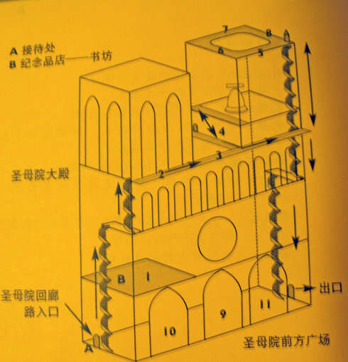 据知,巴黎圣母院钟楼有800多年的历史了。圣母院钟楼建筑共有三层,阶梯是旋转形的,只能容纳一个人通过。右边有扶手,左边是圆形的柱子。上去的游客要左右两手並用,一手按着圆柱,另一手抓住扶手一步一步慢慢爬上去。差不多上到七十多步时可以休息一下,然后继续走完125步到了第一楼。在一楼可以往下面望过去,也可以照纪念相。