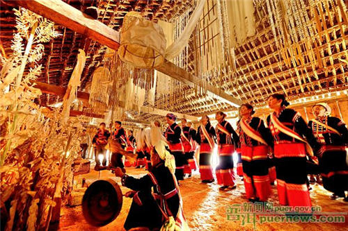 每到重大节庆和重要活动时,全寨子的人都要在寨心举行隆重的祭祀活动,敲响通天神鼓,跳起祭祀摆舞,寨心上方顺石阶而上,是拉祜族最为神圣的地方——佛房祭祀活动区。龙竹棚老寨佛房距今已有300多年历史,仍保持着最完整的、神秘而敬畏的拉祜族原始宗教崇拜。
