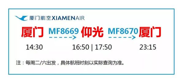 6月22日,厦航开通厦门仰光直达航线,自此结束了福建与缅甸最大城市仰光之间无直达航班的历史。该航线每周二、六执飞两个往返航班,飞行时间3小时50分左右。