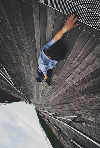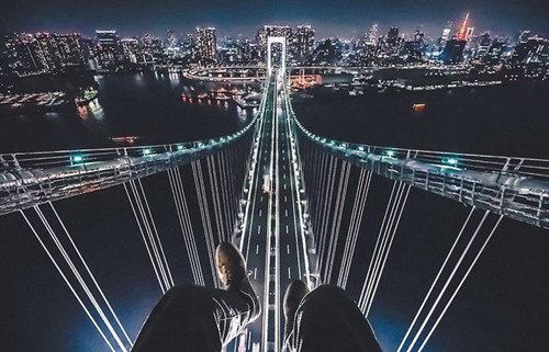这些富有创造力的照片源于 Kaizaki对拍摄角度的准确把握以及拍摄画面的整体构图。在其中一组照片中,照片中的人仿佛只用指尖抓住铁轨枕木,而他的下面则是万丈深渊,实际上,照片中的人物躺在铁轨上。