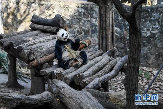 12月20日,26岁的大熊猫“英英”在中国大熊猫保护研究中心都江堰基地里一边享受冬日暖阳一边吃新鲜的竹子。