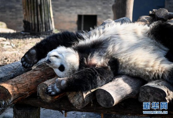 12月20日,海归大熊猫“宝宝”在中国大熊猫保护研究中心都江堰基地里慵懒地享受冬日暖阳。