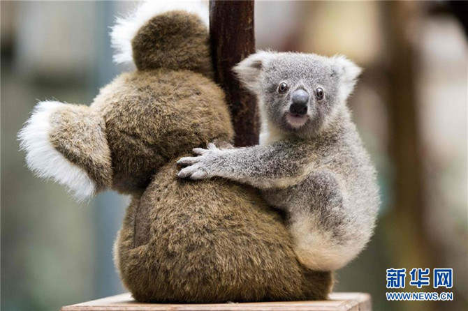 这是2017年7月26日,在德国杜伊斯堡动物园,一只小考拉紧紧抱住一个考拉造型毛绒玩具。新华社/法新