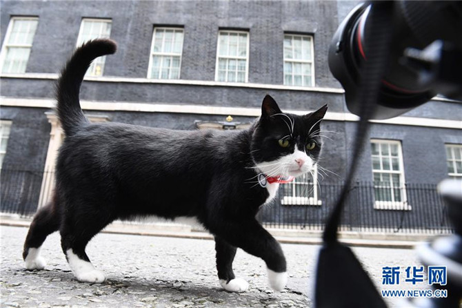 这是2017年6月9日,在英国伦敦唐宁街,“外交部猫”帕默斯顿望向摄影师的相机。新华社/法新