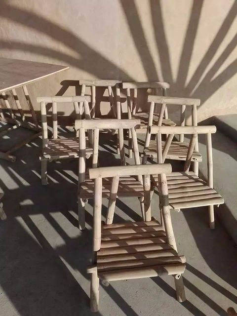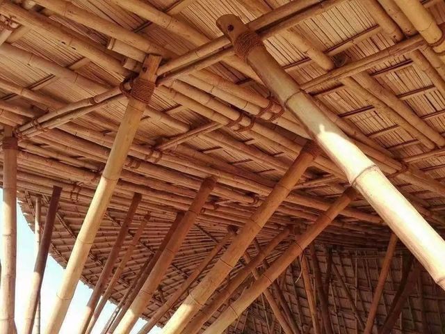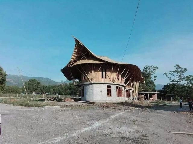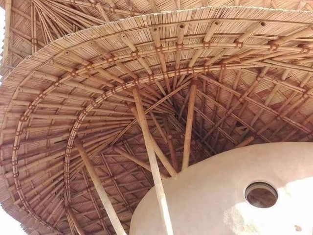 看到砖块砌好地基和墙之后,二楼就开始使用一些大自然所赐予的材料。利用当地丰富的竹子资源,作为房屋结构、装饰材料,还用于制作地板、座椅、桌子和其它器具。