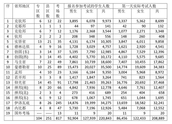 全国各省邦地区的104个专区、251个县区中共开设了817个考场,报名参加次考试的学生人数达到22万多名,比去年增加约8万人(去年报名人数为14万多人)。但第一天实际前来参加考试的人数只有20万8千多人,缺考人数近120,000多人。另外一个特点是,今年公布考生人数时,发现所有省邦地区都是“阴盛阳衰”,女生人数远远多于男生,这究竟是什么原因造成的,也是值得探讨的一个问题了。