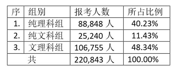 以往几年缅甸高考历时十天左右,现在一周内就全部考完。究其原因是以往组别太多,达到8组之多,现在高考只有三大组:分别为纯理科组、纯文科组及文理科组。今年各组别参加考试的人数如下表: