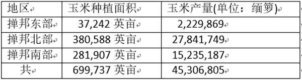 2019年时掸邦东、北、南三个地区的玉米种植面积及产量如下表: