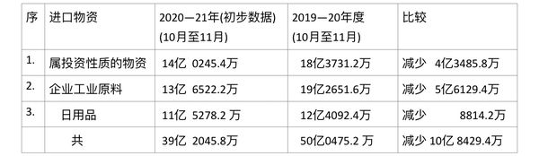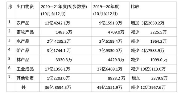 而各项出口物资与去年同期相比如下表(单位:美元):