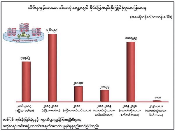 1月28日出版的《缅甸之光》披露公布了两组图表,介绍了这几年来国内外企业家对缅甸住宅与建筑物行业的投资情况,具体数据如下表: