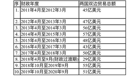 在本财政年度上半年两国边贸总额为19亿美元,而最近十年来两国每年的边贸总额量则如下表: