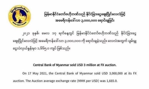 缅甸央行于5月17日以1665缅币兑换1美元的汇率,抛售了300万美元,这也是缅甸央行在过去一周内第三次大笔抛售美元稳定汇率,这三次抛售累计抛出1500万美元。