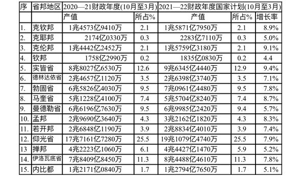 《缅甸之光》报于10月7日、8日公布缅甸2021—22财政年度国家经济计划法律时,顺便也列出了各省、邦地区的国民生产总值(GDP)预估数据。具体数据如下表:   2021—22财政年度6个月过渡期国家经济计划,各省邦地区的生产总值预估如下: