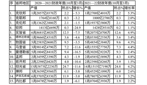 2021—22财政年度6个月过渡期缅甸各省、邦地区的国民生产总值(GDP)预估数据