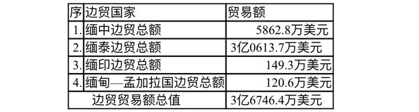缅印边贸总额则为149.3万美元,缅甸—孟加拉国间的边贸总额为120.6万美元。