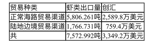 “在现在的新财政年度向国外出口虾类时,由正常的海路贸易渠道出口6,421.297 吨,创汇2,270.8万美元;由陆地边境贸易渠道出口虾类469.887吨,创汇210.6万美元。所以虾类总出口量为6,891.184吨,创汇共为2,481.4万美元。”该负责人这样介绍道。