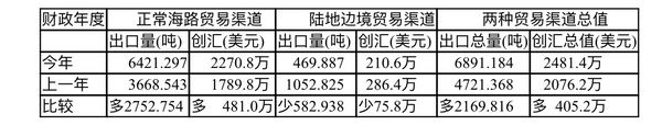 与上一财政年度同期相比,上一财政年度由正常海路贸易渠道出口的虾类为3,668.543吨,创汇1,789.8万美元;由陆地边境贸易渠道出口虾类1,052.825吨,创汇286.4万美元。故虾类总出口量为4,721.368吨,创汇总值为2,076.2万美元。两相比较,本财政年度头5个月虾类多出口2,619.816吨,创汇多405.2万美元。