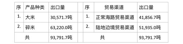 这些大米与碎米出口时,由正常海路贸易渠道出口41,856.7吨,由陆地边境贸易渠道出口51,935吨。由边贸出口的大米碎米多于由海路出口的大米碎米。