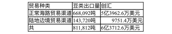 这半年内,通过正常海路贸易渠道出口各种豆类668,092吨,创汇5亿3962.6万美元;通过陆地边境贸易渠道出口143,720吨的各种豆类,创汇9751.4万美元。