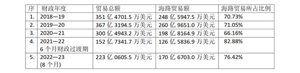 2021—22财政年度属6个月财政过渡期,这期间对外贸易总额为152亿7341.7万美元中,海路贸易额为126亿5836.9万美元。
