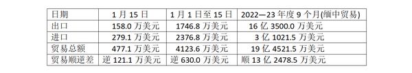 另据1月18日《苗瓦底》英文版报导 ,在2022—23财政年度的9个月(由2022年4月至12月)内,缅中边境贸易总额为19亿4500万美元,其中出口为16亿3500万美元,进口为3亿1021.5万美元。