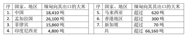 在这12月份内,缅甸通过海路向各亚洲国家出口的大米如下: