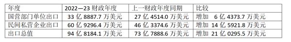 2022—23财政年度,自2022年4月1日至2023年2月3日这10个多月时间内,缅甸向国外出口的工业成品中,由国营部门单位出口33亿8887.7万美元,由民间私营企业出口60亿9296.4万美元,故共出口94亿8184.1万美元。