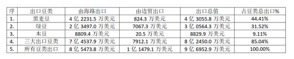 出口的豆类中,由正常的海路贸易渠道出口8亿5473.8万美元,由陆地边境贸易渠道出口1亿1479.1万美元,故这9个月豆类出口总共为9亿6952.9万美元。