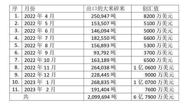 由2022年4月1日至2023年2月为止,各月份出口的大米碎米重量及创汇情况如下表: