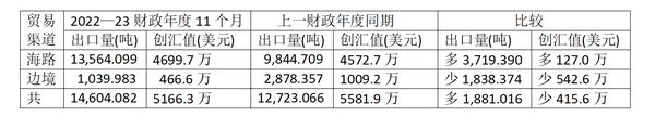 这11个月时间内,由正常海路贸易渠道出口虾类13,564.099公吨,创汇4,699.7万美元;由陆地边境贸易渠道出口虾类1,039.983公吨,创汇466.6万美元;故这期间共出口虾类14,604.082公吨,共创汇5,166.3万美元。