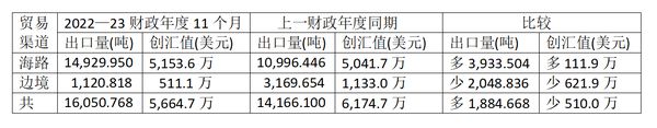 2022—23财政年度,自2022年4月1日至2023年3月31日为止,这一整年向国外出口虾类的情况为:由正常海路贸易渠道出口虾类14,929.95公吨,创汇5,153.6万美元;由陆地边境贸易渠道出口虾类1,120.818公吨,创汇511.1万美元;故这一年度共出口虾类16,050.768公吨,共创汇5, 664.7万美元。