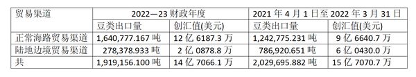 据4月21日出版的《缅甸之光》报报导,在2022—23财政年度,2022年4月1日至2023年3月31日这期间,缅甸由正常海路贸易渠道出口各种豆类164万0777.167吨,创汇12亿6187.3万美元;由陆地边境贸易渠道出口这豆类27万8378.933吨,创汇2亿0878.8万美元。故该财政年度豆类共出口191万9156.1万吨,创汇共为14亿7066.1万美元,这是由经贸部门处获知的讯息。