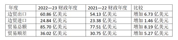 2022—23财政年度期间,缅甸边贸交易总额达到85.7亿美元,其中出口为60.86亿美元,进口为24.84美元,这是由经贸部门方面获知的讯息。