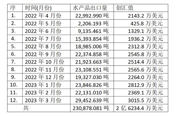 德林达依省方面在这2022—23财政年度内水产品出口情况如下表: