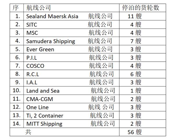 前来停泊的货轮来自Sealand Maersk Asia、SITC等14家国际航线公司,各公司的名称及将在仰光港口停泊的货轮数如下: