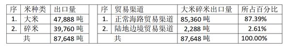 在这样出口时,由正常海路贸易渠道出口85,360吨,由陆地边境贸易渠道出口2,288吨,合共87,648吨。
