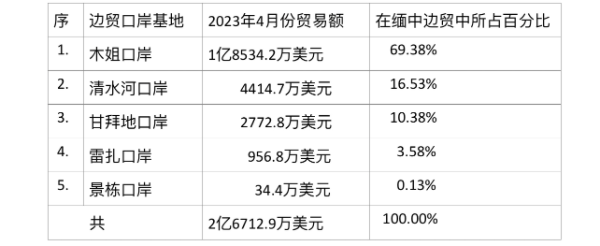 缅中边贸总额在在2023年4月份达到2.67亿美元