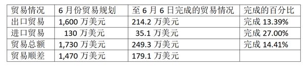 目前直到6月6日为止,出口为214.2万美元,进口35.1万美元,贸易总额为249.3万美元,完成了本月份14%的贸易规划工作。