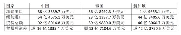 在这一财政年度期间,缅甸最大的贸易伙伴是中国,其次是泰国,新加坡位居第三。这三个国家在该财政年度内与缅甸贸易往来情况如下: