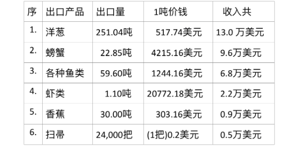 莫山贸易基地在6月19日至25日这一周内主要出口产品为洋葱、螃蟹、各种鱼类、虾类、香蕉及扫帚等。进口的物资为果子、鱼罐头盒等。