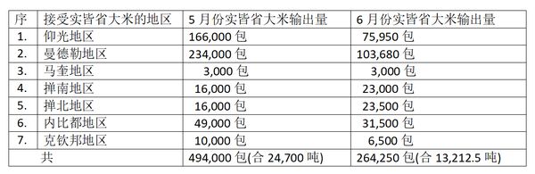 据7月9日出版的《缅甸之光》报报导,实皆省大米富余的地区,诸如瑞帽(Shwebo)专区、格礼(Kalay)专区、杰沙(Katha)专区、甘布鲁(Kabbalu)专区等,在5月份及6月份期间向全国各地区都输送出了大米。这2个月实皆省输送出的大米如下表: