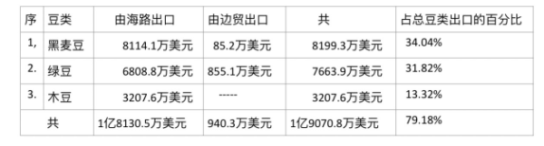 这些出口豆类中,黑麦豆、绿豆及木豆这三大出口豆类的出口情况如下表: