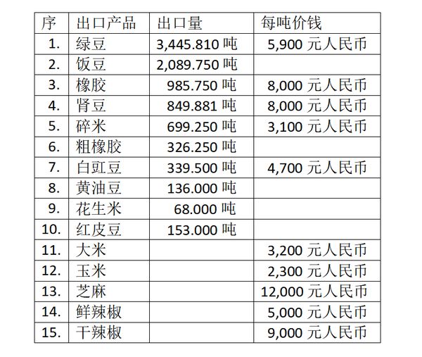 这期间出口最多的产品及其每吨价钱(按人民币计算)如下: